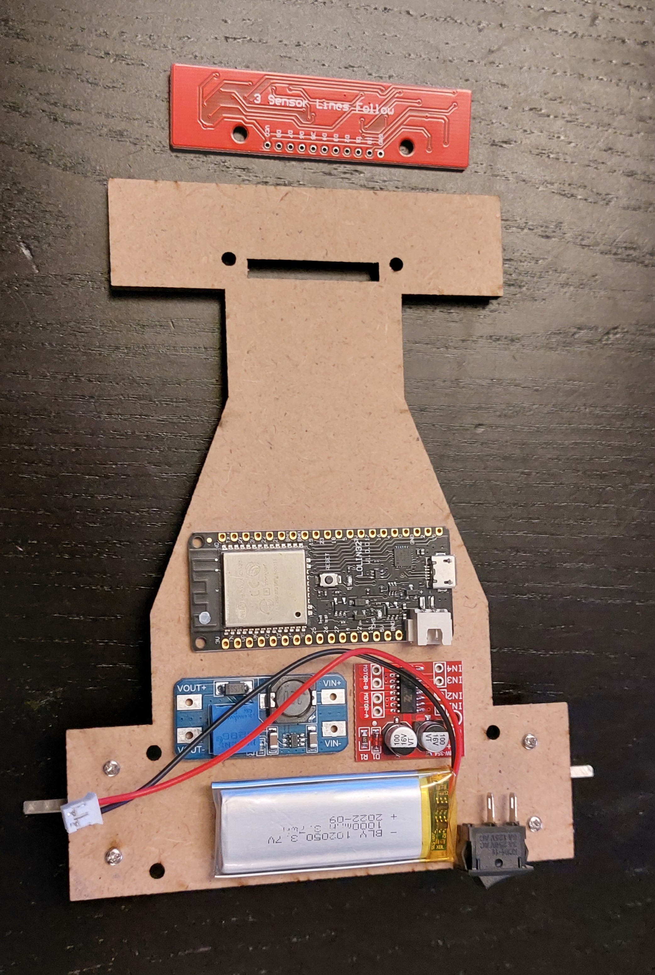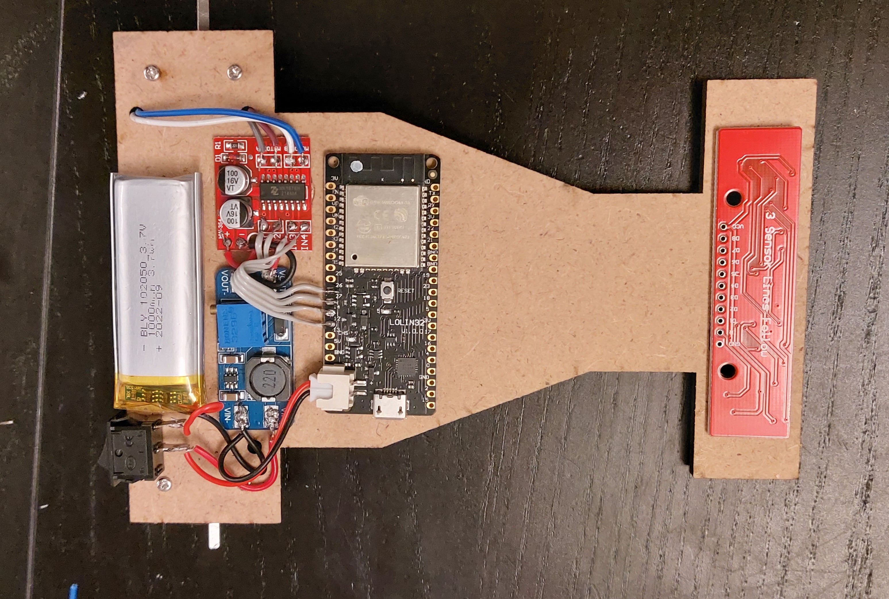 On retourne la plaque et on dispose les éléments. Vous pouvez reconnaitre l'esp32, le driver moteur , une lipo 1S, un élévateur de tension en bleu parce que le bleu c'est plus puissant :D et le capteur de ligne