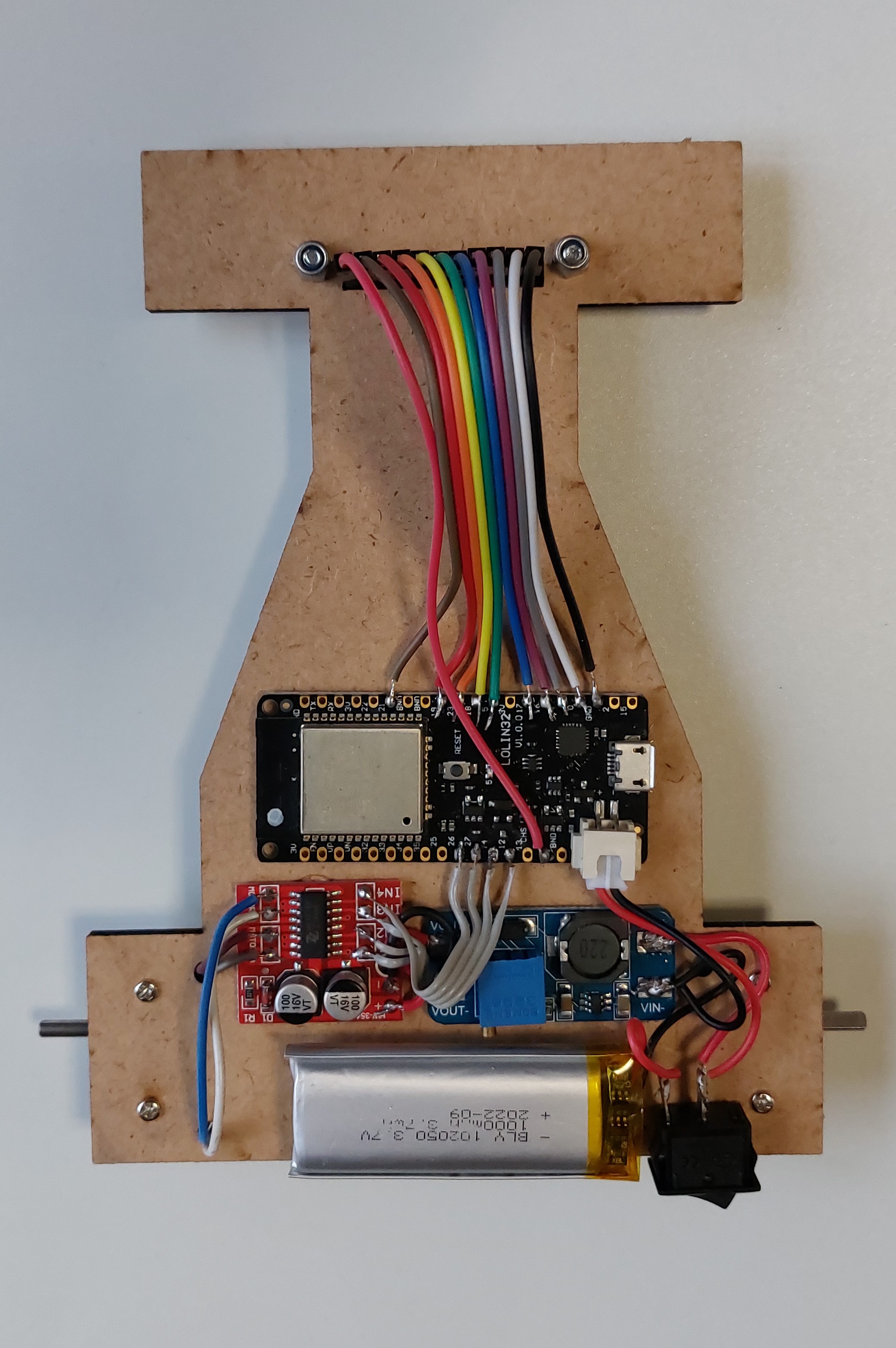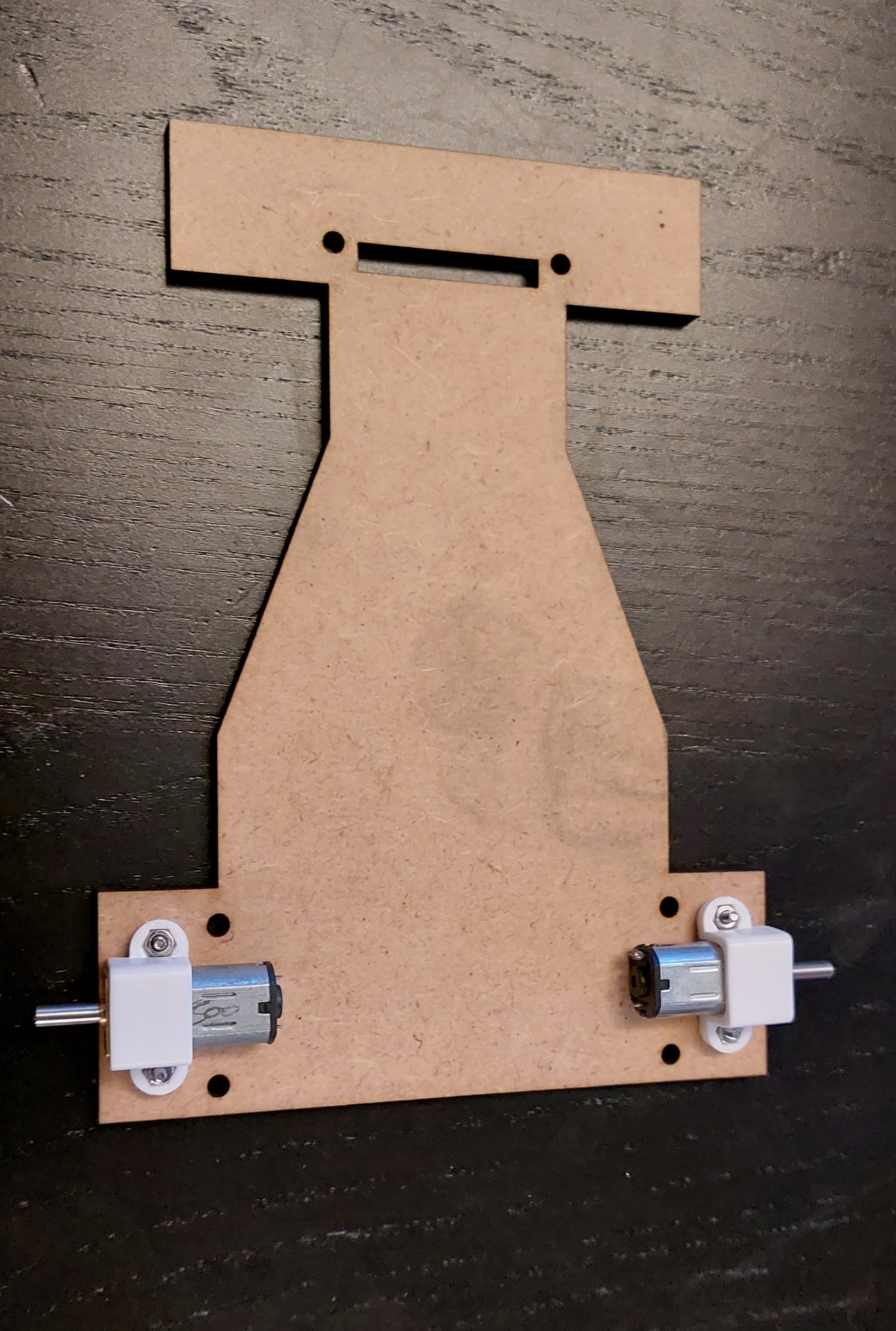 Chassis bois dessiné et découpé à la laser par MicMac. fixation des moteurs 500RPM